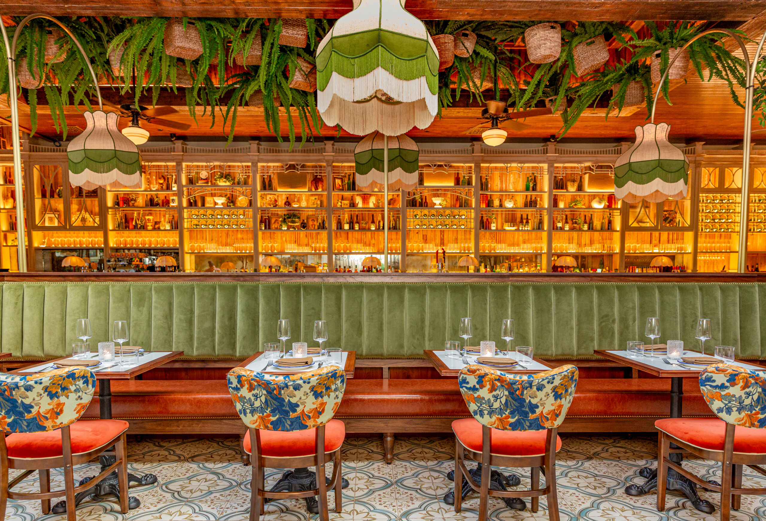 Velvet banquettes sit beneath a sunlit atrium with a retractable glass canopy, filled with greenery and anchored by a rustic fireplace. Distressed plaster walls, reclaimed wrought iron arches, and lush plantings are paired with wide-plank reclaimed wood flooring and ornate Spanish tile. These elements come together in layers, creating a space that feels relaxed, warm, and inviting. The back room offers a more refined experience, with a large floral chandelier and arched windows, designed to feel like a special place to celebrate life.”