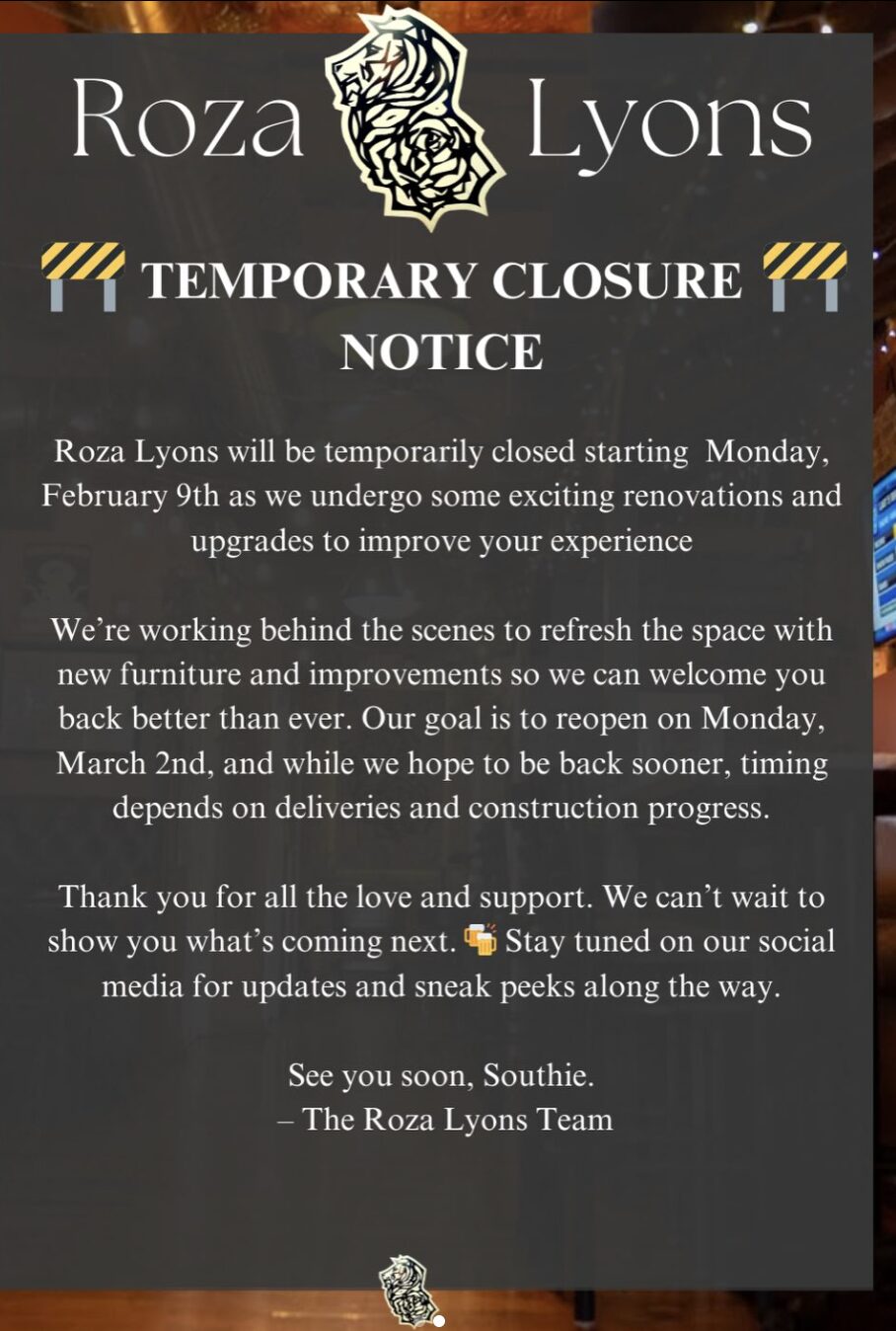 On Thursday evening, Roza Lyons announced that it will be temporarily closed starting Monday, February 9th, for a refresh and renovations!