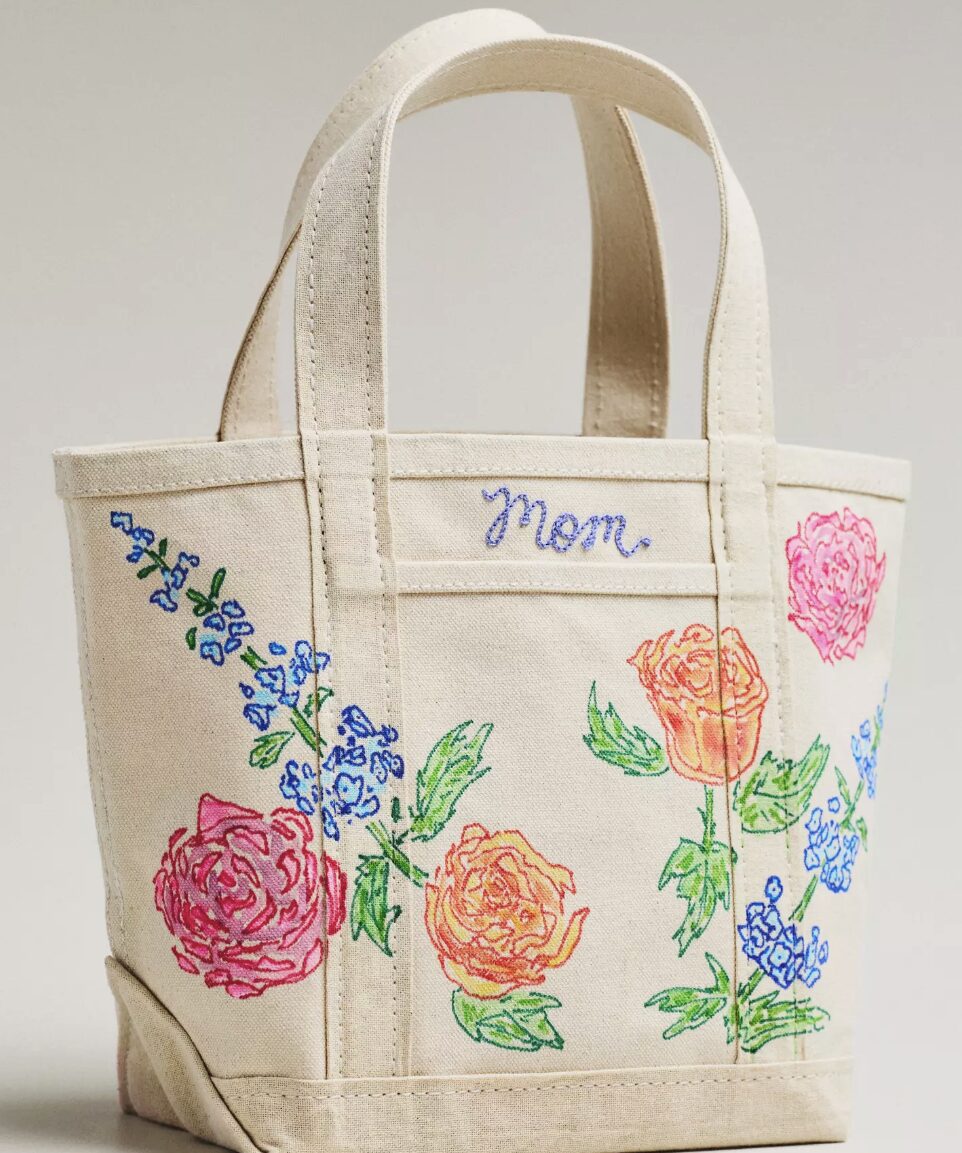 There are four options for the Maker/Scholar tote, including “Mom” with bright hand painted flowers, “Mama Mia” with tomatoes and pasta, “Caffeinated” with espresso martinis and iced coffees, and “Golden Girl” for all the Golden Retriever moms out there.